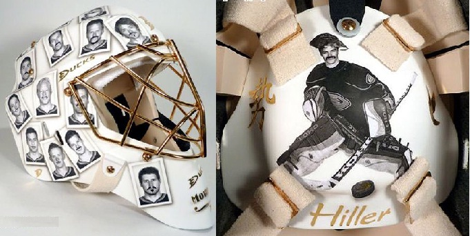 Movember is the month-long effort to raise funds and awareness for men’s health issues by growing fabulous facial hair throughout November. Anaheim Ducks goaltender Jonas Hiller may have just raised the bar not only for Movember in the NHL, but for goalie masks as well. Instead of his black-matted mask, he’ll be wearing a white-matted mask with black-and-white images of his teammates rocking sublime and ridiculous fake mustaches, created by the artist. It features Teemu Selanne, Corey Perry, Ryan Getzlaf, Bobby Ryan, George Parros, Dan Ellis and many other teammates.
