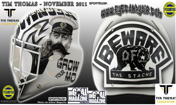Boston Bruins netminder, and mustachioed man himself, Tim Thomas introducing his own mask to spread the word about Movember. Note the mustache on the bear…. nice touch!
